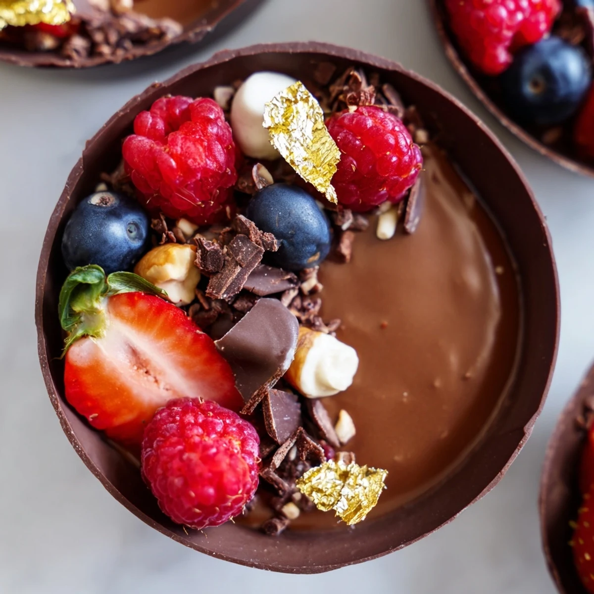These sophisticated chocolate grazing cups combine handmade dark chocolate shells with velvety chocolate mousse, creating an impressive dessert that tastes as beautiful as it looks. Fresh mixed berries provide tart contrast, while chopped nuts, marshmallows, and chocolate curls add delightful texture variety. The edible gold leaf adds that special occasion touch perfect for celebrations.
