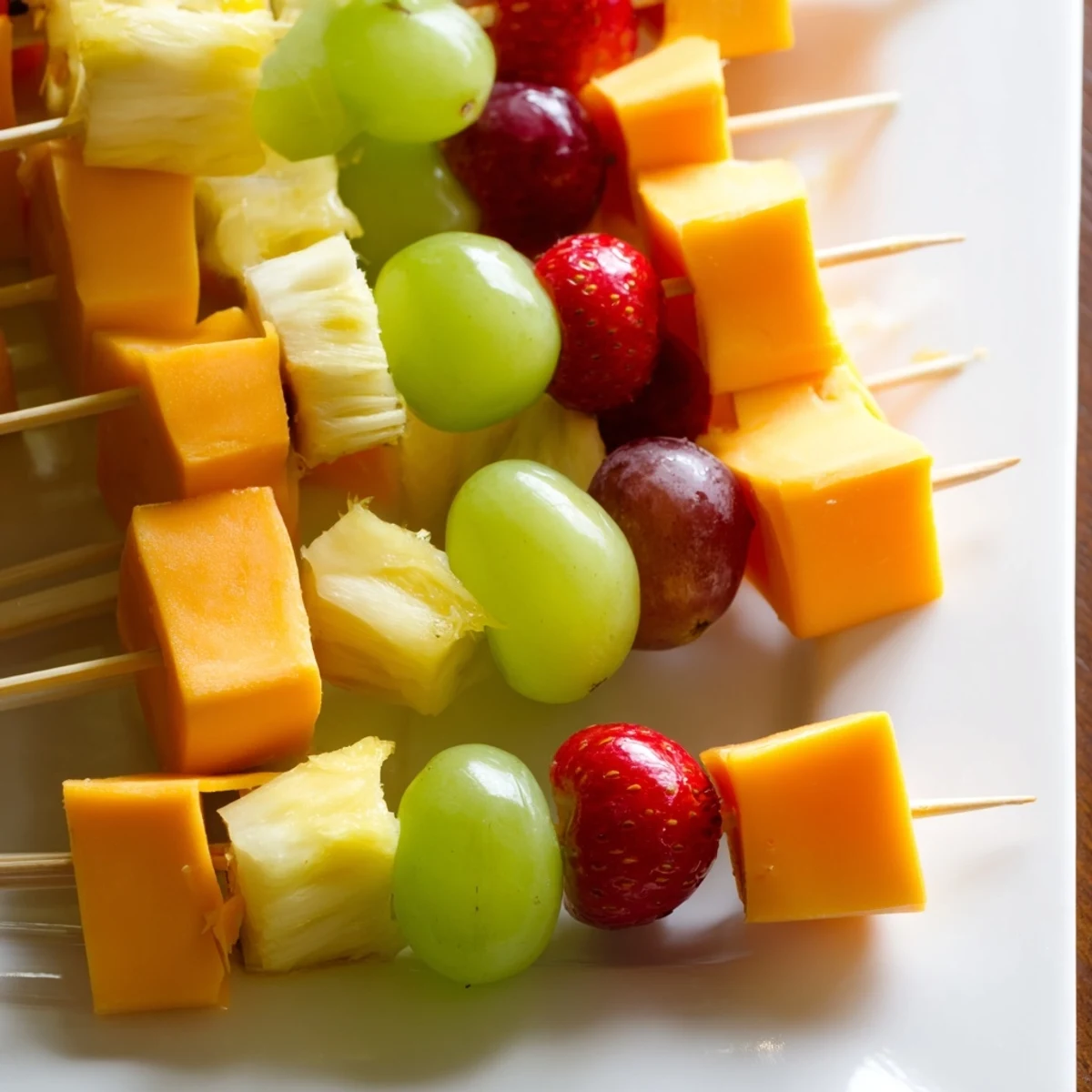 Create stunning party appetizers in just 15 minutes with these colorful skewers featuring fresh strawberries, green and red grapes, sweet pineapple chunks paired with cubes of sharp cheddar and smooth Monterey Jack. The alternating pattern creates visual appeal while balancing sweet and savory flavors.