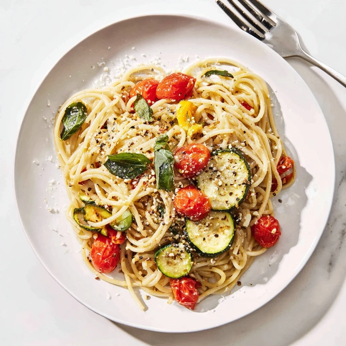 This colorful Italian-inspired dish brings together summer's best vegetables in a quick, satisfying meal. Tender zucchini half-moons and sweet cherry tomatoes simmer with aromatic garlic and onion until softened, creating a natural silky sauce that coats each strand of pasta. Fresh basil and parsley add bright, herbal notes while Parmesan brings savory depth. The entire dish comes together in just 35 minutes, making it perfect for busy weeknights when you want something nourishing without spending hours in the kitchen.